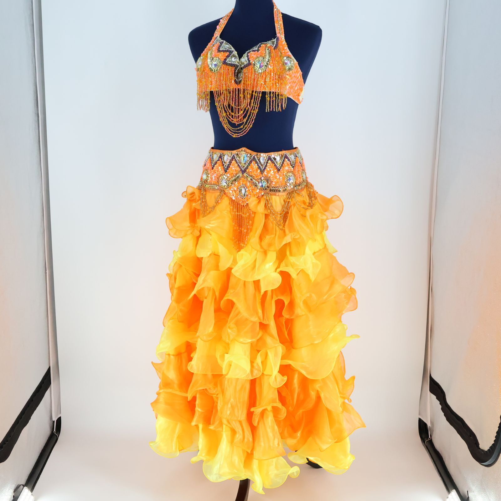 | メーカー | ベリーダンス 衣装 オレンジ オリエンタル ブラベルトスカートセット 着画 |