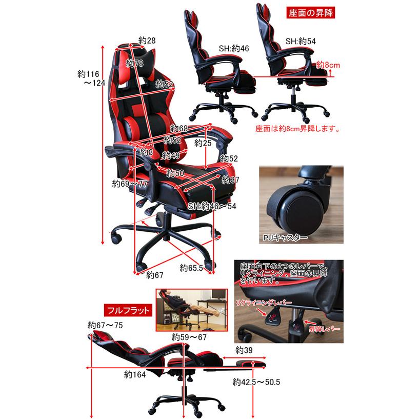 | 商品の特徴 | ゲーミングチェア フルフラット チェア ハイバック おしゃれ。Amazon.co.jp: SKYE ゲーミングチェア 座り心地最高 デスクチェア。早い者勝ち!再入荷!最安値 !ゲーミングチェア デスクチェア 送料。ご覧頂きありがとうございます♪♪ご好評により早い者勝ち商品です。サカベ フルフラット リクライニング デスクチェア ゲーミングチェアー。3色ございます♪♪フルフラットバケットレーシングチェアです!フルフラットでくつろげる多機能オフィスチェアですこだわりのバケットシート仕様です厚みのあるクッションで体を深く包み込み姿勢を安定できます約78cmのハイバック仕様で頭までしっかりホールドします 首を支えるクッションと背当てや腰当てに使えるクッションが合わせて2個付属しますクッションはゴムバンドで固定しています取り外してご使用いただくことも可能です背当てのクッションは高さの位置を動かせます無段階リクライニング機能付きレバー操作で好きな角度でお使い頂けます出し入れ自由な格納式フットレスト付きこちらは手動で出し入れして頂きます座面は約8cm昇降可能ですレバー操作で調節可能ですキャスターはフローリングでも傷が付きにくいPUキャスターを使用していますブルー(BL)、グレー(GR)、レッド(RD)の3色展開です沖縄県には発送していません!☆他にもパソコンデスクチェア、家具等出品中☆レーシングチェア ゲーミングチェア パソコンパソコンデスク パソコンチェア 机 送料無料MacBook ゲーム 椅子 インテリア IKEA ニトリ pc | ||
